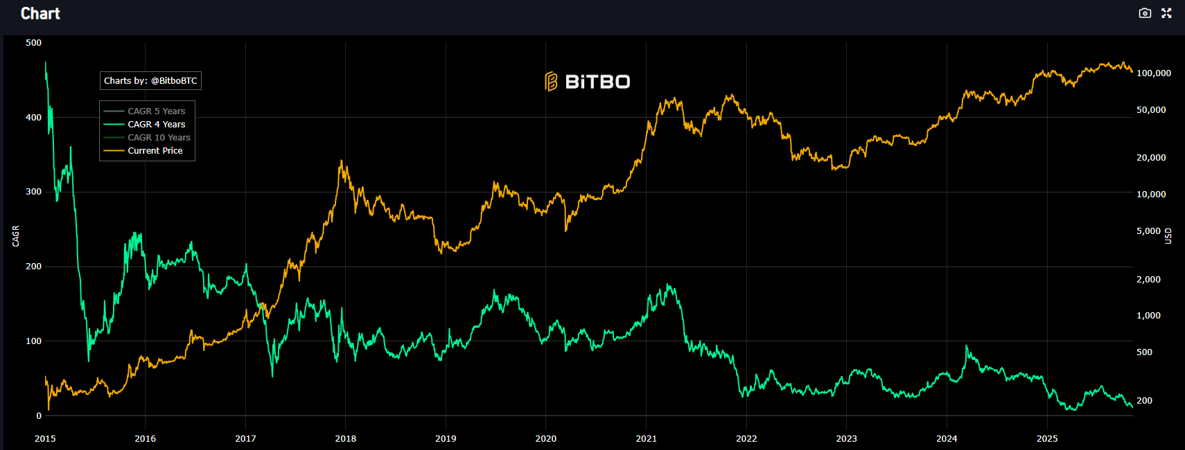 Bitcoin’in dört yıllık CAGR’ı istikrarlı bir şekilde düşüyor. Kaynak: Bitbo